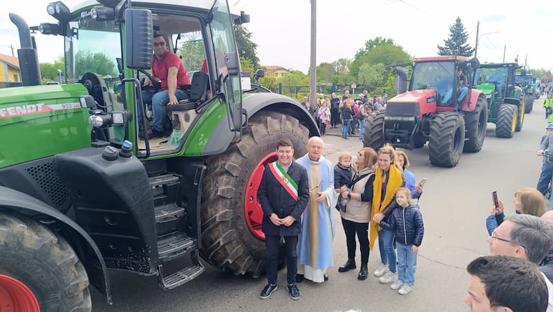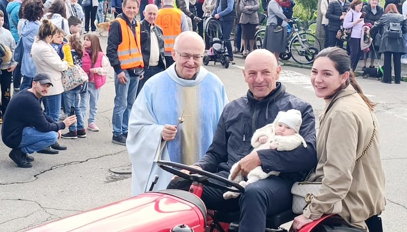 BUSTO ARSIZIO – Trattori e “insalata e ciàpi” alla Madonna in Veroncora: è la Pasquetta più bustocca che ci sia. La tradizione si è rinnovata questa mattina, lunedì 21 aprile, alla chiesetta di campagna ai margini del quartiere del Redentore. Di fronte al Prevosto monsignor Severino Pagani, che impartiva le benedizioni, hanno sfilato 75 trattori e diverse generazioni di autisti e passeggeri, dalla mitica Irene, che è prossima a compiere 100 anni, alla piccola Eva, due mesi e mezzo, portata in braccio dalla mamma Francesca, 30 anni e trenta sfilate alle spalle.